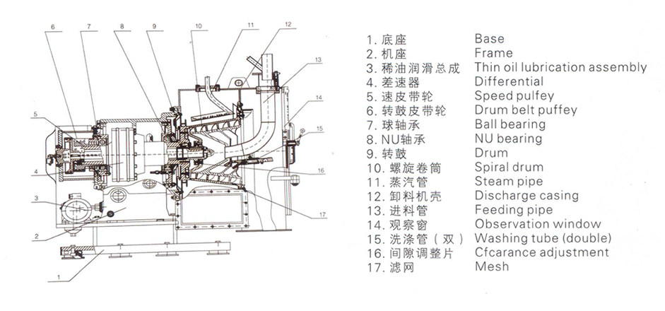 為了減少固態(tài)物的排放阻力,過濾筒有一定的傾斜角度(脫水角度)。利用傾斜角度和螺旋葉片,減少了固體排放阻力。不但極大的提高了其排放效率,而且具有耗電量低,處理量大的優(yōu)點。